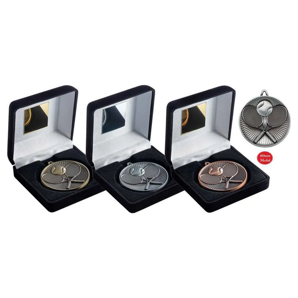 BLACK VELVET BOX AND 60mm MEDAL TENNIS TROPHY BRONZE
