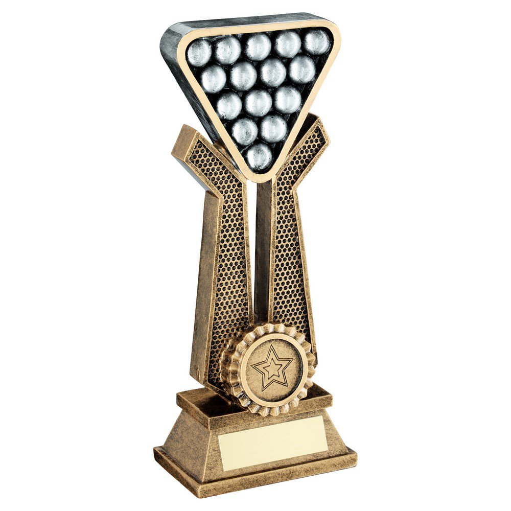 BRZ/PEW/GOLD POOL/SNOOKER BALLS ON TWIN PRONGS WITH PLATE (1in CENTRE) - 10in 254MM. Free engraving on the supplied plate. Available in different sizes