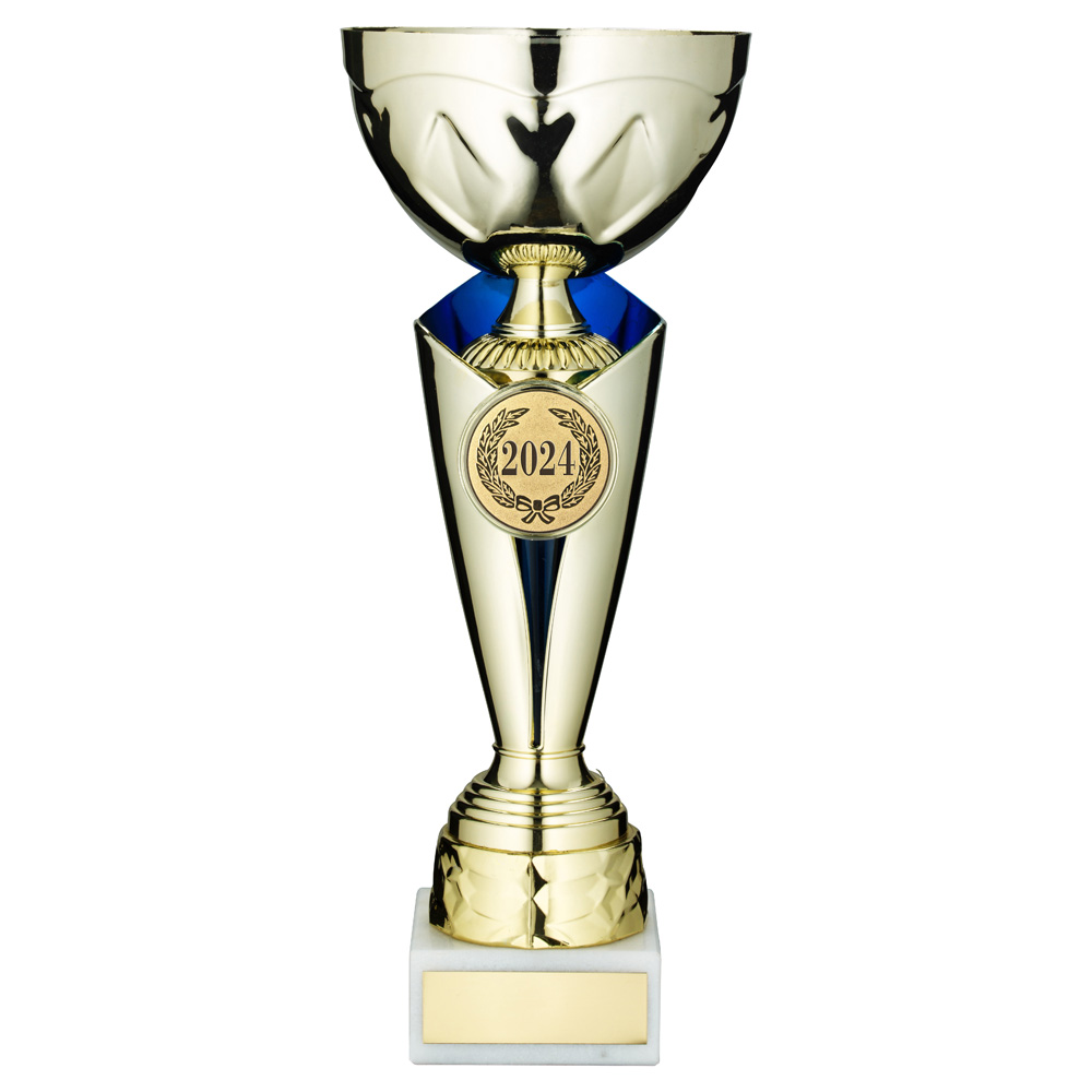 GOLD/BLUE TROPHY CUP WITH PLATE (2in CENTRE) - 13.75in. Available in different sizes. Free engraving on the supplied plate.