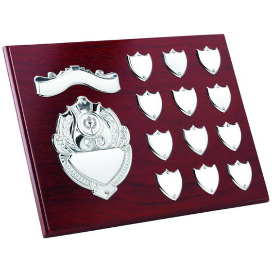 Rosewood Plaque With Chrome Fronts And Record Shields (1in Centre) - 9 x 12in (229 X 305mm). Please contact us should you have extra engraving requirements such as the annual plates. We will be happy to help.