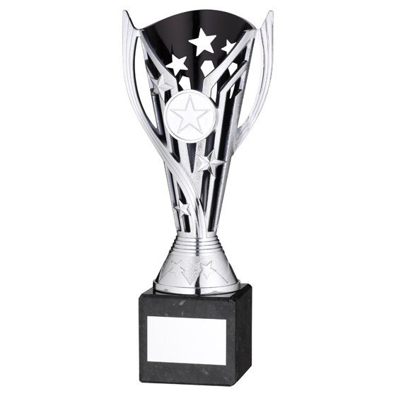 SILVER/BLK PLASTIC 'FLASH' CUP ON BLK MARBLE ASSEMBLED TROPHY (1" CEN) - 8in. Available in different sizes. Free engraving on the supplied plate.