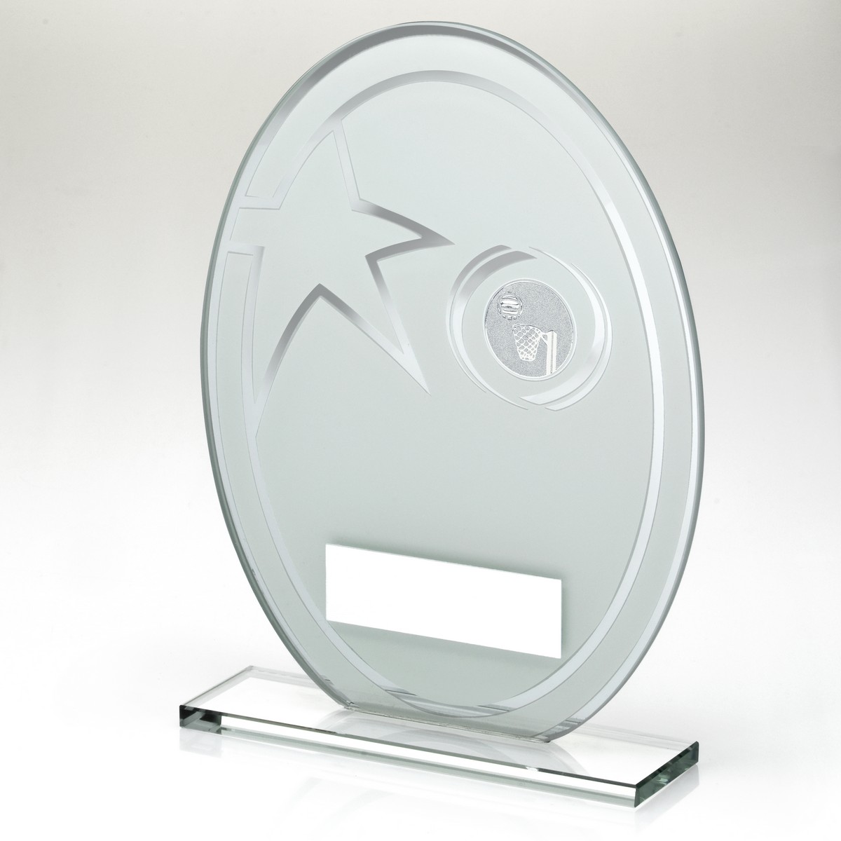 WHITE/SILVER PRINTED GLASS OVAL WITH NETBALL INSERT AND PLATE - 6.5in Available in different sizes. Free engraving on the supplied plate.